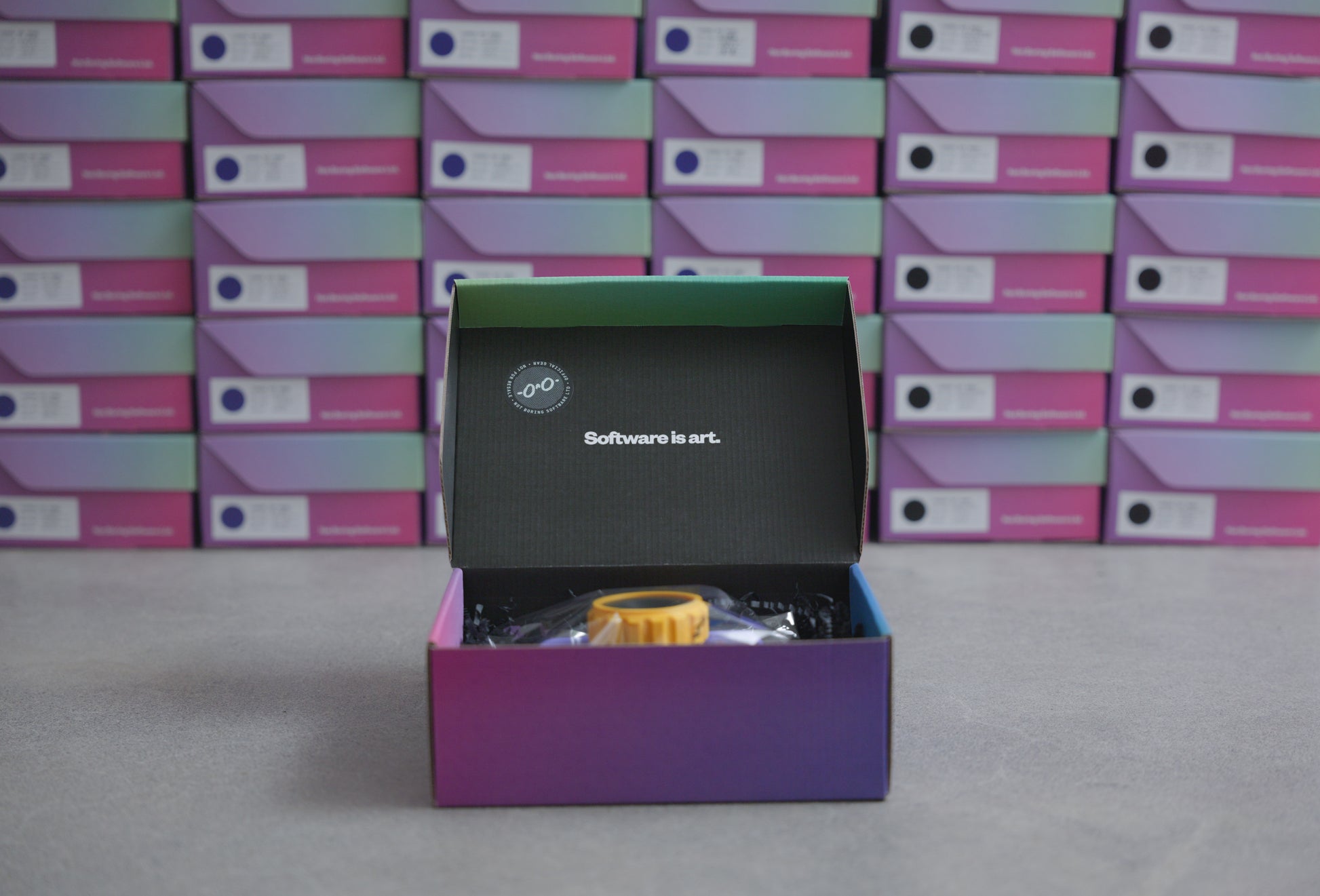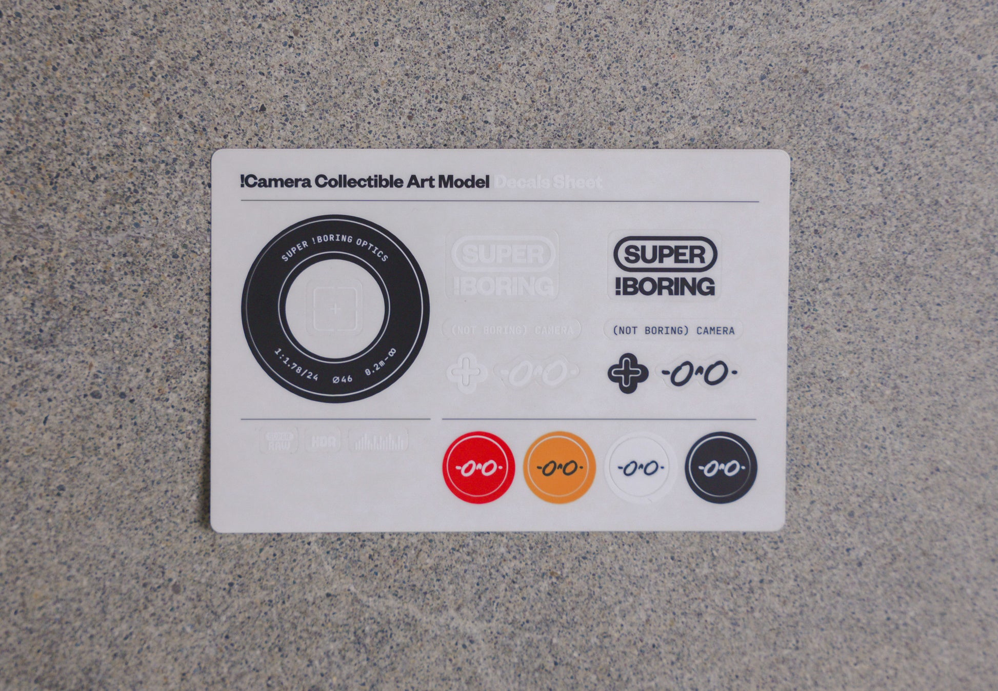This is a true-scale art model of the (Not Boring) Camera app with moveable parts: lens rotates, dials spin, buttons depress, and switch slides. Includes a sheet of sticker decals, a postcard hand-signed & numbered by the artist, and a collectible box.